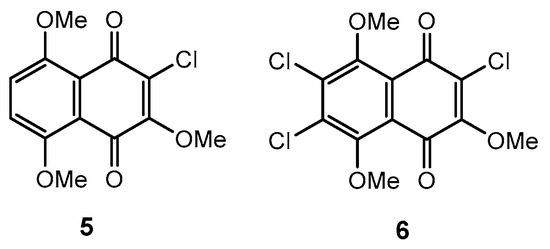 The starting substituted 2-chloro-3,5,8-trimethoxy-1,4-naphthoquinones 5 and 6 were prepared by treatment of appropriated 2,3-dichloro-5,8-dimethoxynaphtalene-1,4-dione and 2,3,6,7-tetrachloro-5,8-dimethoxynaphtalene-1,4-dione with AcONa in dry methanol at reflux as described earlier [27] (Figure 1). Bromination of available hydroxyjuglone derivatives 7 and 8 in chloroform solution according to the work in [28] led to bromoquinones 9 and 10 in good yields, 92%. Subsequent treatment of quinones 9 and 10 in 1,4-dioxane with 0.2 M ethereal diazomethane solution and crystallization from MeOH gave a second pair of initial bromomethoxyjuglones 11 and 12 in yields 85% (Scheme 2), which were identical to such compounds described in [29].