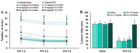 An 8 Arm radial maze test (8-ARMT) was conducted to investigate the difference in spatial memory between all experimental groups following TFI (Figure 1A). Numbers of errors in the 8-ARMT were not significantly different between all sham groups (groups pretreated with vehicle and CGA (7.5, 15 and 30 mg/kg) and subjected to sham TFI) at 3, 4 and 5 days after sham TFI (Figure 1A). However, in the vehicle/TFI group (group pretreated with vehicle and subjected to TFI) and 7.5 and 15 mg/kg CGA/TFI groups (groups pretreated with 7.5 and 15 mg/kg of CGA and subjected to TFI), the numbers of the errors were significantly increased after TFI (Figure 1A). On the other hand, the numbers of the errors in the 30 mg/kg CGA/TFI group were remarkably reduced after TFI (Figure 1A).