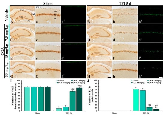 NeuN immunohistochemistry (A–H,A(a)–H(h)) and (F–J) B histofluorescence (A(a’)–H(h’)) in the hippocampus (A–H) and CA1 region (A(a)–H(h),A(a’)–H(h’)) of the vehicle/sham and vehicle/TFI (A(a,a’),B(b,b’)), 7.5 mg/kg CGA/sham and CGA/TFI (C(c,c’),D(d,d’)), 15 mg/kg CGA/sham and CGA /TFI (E(e,e’), F(f,f’) and 30 mg/kg CGA/sham and CGA/TFI (G(g,g’),H(h,h’)) groups at 5 days after TFI. NeuN+ neurons are markedly reduced in the stratum pyramidale (SP) of the CA1 region of the vehicle/TFI group. Numerous F-J B+ cells are observed in the SP of the vehicle/TFI, 7.5 mg/kg CGA/TFI and 15 mg/kg CGA/TFI groups. In the 30 mg/kg CGA/TFI group, numerous NeuN+ neurons and no F-J B+ cells are detected in the SP. DG, dentate gyrus; SO, stratum oriens; SP, stratum pyramidale; SR, stratum radiatum. Scale bars = 400 μm (A–H) 40 μm (A(a)–H(h),A(a’)–H(h’)). I and J: mean numbers of NeuN+ (I) and F-J B+ cells (J) in the SP of the CA1 region. The bars indicate the means ± SEM (n = 7 in each group, * p < 0.05 vs. the corresponding sham group, †p < 0.05 vs. the vehicle/TFI group, # p < 0.05 vs. the 7.5 mg/kg CGA/TFI group, @ p < 0.05 vs. the 15 mg/kg CGA/TFI group).