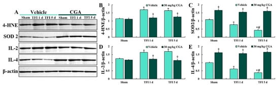 Representative Western blot images of 4-HNE, SOD2, IL-4 and IL-2 in the CA1 region (A) and densitometric analyses of them (B–E) in the vehicle/sham, vehicle/TFI, CGA/sham and CGA/TFI groups at 5 days after TFI. Levels of 4-HNE and IL-2 are increased in the vehicle/TFI group, but the 4-HNE and IL-2 levels in the GCA/TFI group are not altered after TFI. Levels of SOD2 and IL-2 are markedly decreased after TFI, but they are significantly higher in the CGA/sham and CGA/TFI groups than those in the vehicle/sham group days after TFI. The bars indicate the means ± SEM (n = 5 at each point in time after TFI, * p < 0.05 vs. the vehicle/sham group, † p < 0.05 vs. the corresponding time point vehicle group, # p < 0.05 vs. the pretime point vehicle group).