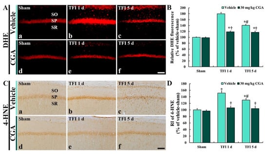 In the CGA/sham group, 4-HNE immunoreactivity in the CA1 pyramidal cells was not different from that in the vehicle/sham group (Figure 4C(d),D). The 4-HNE immunoreactivity in the CGA/TFI group was markedly low (about 29.8% at 1 day and 19.9% at 5 days vs. the corresponding vehicle/TFI group) compared with that in the vehicle/TFI group (Figure 4C(e),C(f),D).