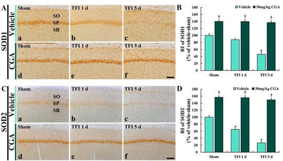 On the other hand, in the CGA/sham group, the SOD2 immunoreactivity in the CA1 pyramidal cells was significantly increased (about 157% vs. the vehicle/sham group) compared to that in the vehicle/sham group (Figure 5C(d),D). In addition, the increased SOD2 immunoreactivity was sustained (about 156% at 1 day and 149% at 5 days vs. the vehicle/sham group) after TFI (Figure 5C(e,f),D).
