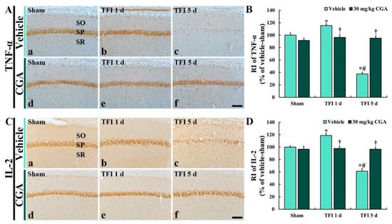 In the CGA/sham group, TNF-α immunoreactivity in the CA1 pyramidal neurons was not different from that in the vehicle/sham group (Figure 6A(d),B). In addition, in the CGA/TFI group, the TNF-α immunoreactivity was not significantly altered at 1 day (about 96% vs. the vehicle/sham group) and 5 days (about 96% vs. the vehicle/sham group) after TFI (Figure 6A(e,f),B)).