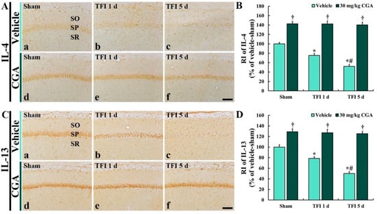 In the CGA/sham group, IL-4 immunoreactivity in the CA1 pyramidal neurons was significantly higher (about 143% vs. the vehicle/sham group) than that in the vehicle/sham group (Figure 7A(d),B). Moreover, in the CGA/TFI group, the enhanced IL-4 immunoreactivity was maintained at 1 day (about 142% vs. the vehicle/sham group) and 5 days (about 140% vs. the vehicle/sham group) after TFI (Figure 7A(e,f),B).