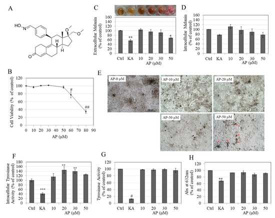 (A) Chemical structure of asoprisnil (AP); (B) Viability of B16F10 mouse melanoma cells treated for 72 h in the presence of different concentrations of AP as measured by the reduction in the tetrazolium salt MTS. Control wells were treated with 0.4% DMSO; # p = 0.0027; ## p < 0.0001; (C) Extracellular melanin in cultures of B16F10 cells treated with AP for 72 h; panel shows pictures of the corresponding cell culture medium; * p < 0.05; ** p < 0.01 vs. Control; one-way ANOVA with Dunnett’s test; (D) intracellular melanin levels; kojic acid (KA) at 0.5 mM was used as a positive control; (E) photomicrographs of B16F10 cells treated with different concentrations of AP; objective magnification is 20x; melanin aggregation is visible in AP-50 µM group (red arrows); (F) effect of AP on intracellular tyrosinase activity in B16F10 cells; (G) direct effect of AP on tyrosinase activity using mushroom tyrosinase enzyme; (H) effect of AP on copper chelation activity measured by absorbance at 632 nm; KA was used as a positive control at 500 µM in all assays; ** p < 0.01; *** p < 0.001, and # p < 0.0001 vs. Ctrl by one-way ANOVA followed by Dunnett’s post-hoc test. All data are mean ± SEM of at least three independent experiments, except for (F), which is mean ± SEM pooled from two separate experiments, and (H), which is mean ± SEM of at least two independent experiments.