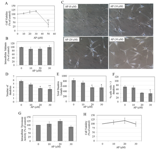 (A) Viability of HEM-DP cells treated with AP at various doses for 5 d; ** p < 0.01 vs. Control group; one-way ANOVA with Dunnett’s test; (B) intracellular melanin levels; and (C) representative phase-contrast images of cells treated with AP (0–30 µM) taken at 20x objective magnification; melanocyte dendricity quantification by parameters: (D) Number of dendrites, (E) total dendrite length, and (F) % cells with >3 dendrites; a total of ~100 cells were counted for each treatment group; * p < 0.05 and ** p < 0.01 by one-way ANOVA with Dunnett’s test; (G) Intracellular tyrosinase activity in cultures of HEMn-DP cells treated with AP for 5 d; (H) viability of human keratinocytes (HaCaT) treated with AP at various doses for 5 d. All data are mean ± SEM of at least three independent experiments.