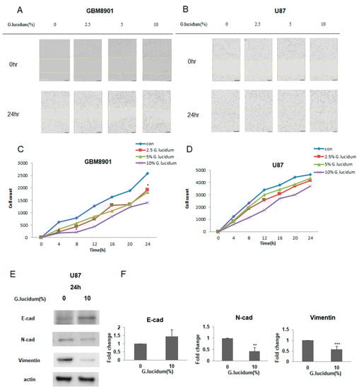 3.4. G. lucidum Extract Inhibits Cell Migration in Glioblastoma Cells