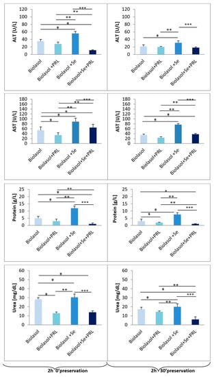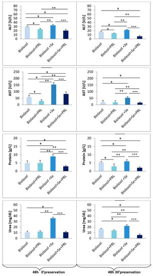 The effect of selenium on ALT, AST, protein, urea levels in porcine kidneys (48 h 0′and 48 h 30′ preservation). Means ± standard deviations (SD) are shown. The symbols represent a significant difference (p < 0.05) compared with the Biolasol® group (*), the Biolasol®+PRL group (**), and the Biolasol®+Se group (***).