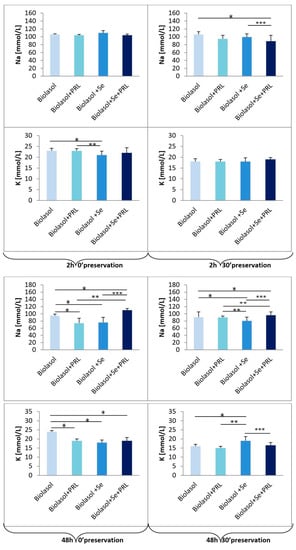 The effect of selenium on sodium and potassium levels in porcine kidneys (2 h 0′; 2 h 30′ and 48 h 0′; 48 h 30′ preservation). Means ± standard deviations (SD) are shown. The symbols represent a significant difference (p < 0.05) compared with the Biolasol® group (*), the Biolasol®+PRL group (**), and the Biolasol®+Se group (***).
