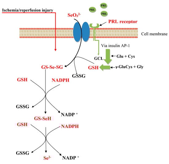 Proposition of the mechanism of prolactin action in the metabolic reduction of selenite (SO32−) during ischemia/reperfusion. GSH, reduced glutathione; GSSG, oxidized glutathione; GS-Se-SG, selenodiglutathione; GS-SeH, glutathioselenol; Se2−, selenide; PRL, prolactin; GCL, glutamate cysteine ligase; Glu, Glutamate; Cys, Cysteine; Gly, Glycine; γ-GluCys, γ-Glutamyl-cysteine; AP-1, activator protein-1; NADPH, nicotinamide adenine dinucleotide phosphate; NADP+, oxidized form of the electron donor nicotinamide adenine dinucleotide phosphate.