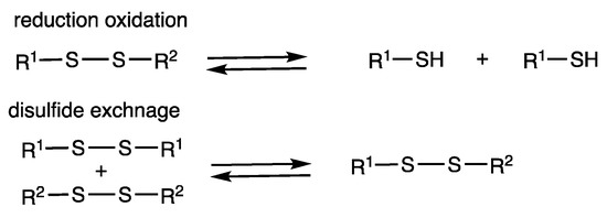 An important reversible reaction of disulfides is their reduction to thiols, which may be oxidized to disulfides (Figure 1). Such reactivity has been utilized in biological systems and also in synthetic systems for molecular switching [14]. Various reactions have been reported for the interconversion. The exchange reaction of S-S bonds between disulfides is another important reversible reaction (Scheme 1) [15,16]. The reaction of two different disulfides produces a statistical 1:1:2 mixture of two symmetric disulfides and an unsymmetric disulfide under chemical equilibrium when their thermodynamic stabilities are comparable.
