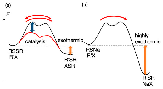 Synthesis of organosulfur compounds has generally been conducted using thiols, and a typical method is a substitution reaction with organohalogen compounds in the presence of a base [17,18,19,20]. The roles of bases are to form highly reactive thiolate anions and to neutralize hydrogen halides formed as byproducts. The neutralization reaction is significantly exothermic and promotes the reaction according to the Bell–Evans–Polanyi principle [17].
