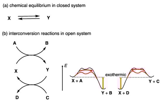 (a) Chemical equilibrium in a closed system between X and Y. (b) Interconversion reaction in an open system between X and Y, in which the relative thermodynamic stability of substrates and products is inverted and induces X + A → Y + B and Y + C → X + D reactions.