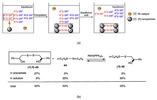 When one product is removed from the solution of the disulfide exchange reaction, the chemical equilibrium can be shifted (Figure 5a) [33]. We developed a silica nanoparticle precipitation method, in which nanoparticles precipitated from solution with concomitant molecular recognition and adsorption of molecules. Silica (P)-nanoparticles of 70 nm mean diameter grafted with (P)-helicene were employed. When butyl (R)-(hydroxyphenylmethyl) disulfide (R)-45 was treated with RhH(PPh3)4 (20 mol%), trifluoromethanesulfonic acid (40 mol%), and (p-tol)3P (80 mol%) in chlorobenzene for 24 h in the presence of silica (P)-nanoparticles, precipitates containing (R,R)-bis(hydroxyphenylmethyl) disulfide (R, R)-43 (27%) and (R)-45 (3%) were formed (Figure 5b). The high preference for (R, R)-43 is notable, and no dibutyl disulfide 44 was contained in the precipitates. The solution phase contained (R, R)-43 (6%), (R)-45 (30%), and 44 (33%). The composition of disulfides in the precipitates deviates considerably from that of the initial chemical equilibrium with (R, R)-43:(R)-45:44 = 1:2:1. It should also be noted that most of the butylthio group remained in solution.