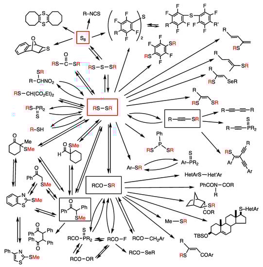 Organosulfur compounds containing C-S bonds are widely used for the manufacture of drugs and materials. Compared with organic compounds containing oxygen, which is another group 16(6A) element, different properties appear owing to the large size and polarizability of sulfur atoms. A characteristic feature of inorganic and organic sulfur compounds is the involvement of different oxidation states (between −2 and +6) of sulfur atoms, which give rise to diverse sulfur functional groups [1]. Thiols (RSH) and sulfonic acids (RSO3H) are organosulfur compounds with low and high oxidation states, respectively. Sulfenic acids (RSOH) and sulfinic acids (RSO2H) exhibit intermediate oxidation states. These sulfur acids can form ester and amide derivatives. Elemental sulfur in the oxidation state of 0 is a convenient source of organosulfur compounds.