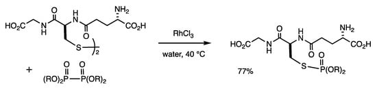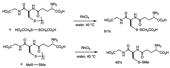The disulfide exchange reaction of hydrophilic disulfides occurs in water when using the RhCl3 catalyst (Scheme 2) [34]. When glutathione disulfide and glycolic acid disulfide (4 equivalents) were treated with RhCl3 (10 mol%) in water at 40 °C for 1 h, methylthiolated glutathione was obtained in 81% yield. The reverse reaction confirmed the involvement of chemical equilibrium. In addition, the composition under chemical equilibrium could be changed by the addition of a disulfide, which indicated that catalysis occurred after reaching chemical equilibrium. This method can be applied to the reaction of dimethyl disulfide, which is not water-soluble. A two-phase system of glutathione disulfide in water and excess dimethyl disulfide was treated with RhCl3 (10 mol%) at 40 °C for 1 h, and methylthiolated glutathione was obtained in 40% yield.