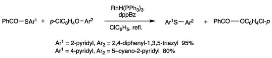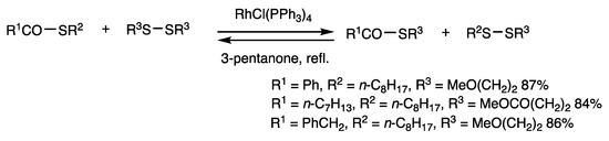 Thioesters are excellent substrates for rhodium-catalyzed reactions and provide various acyl derivatives by their reactions with different substrates. Organothio exchange reaction of thioesters occurs with disulfides (Scheme 4) [36]. S-Octyl benzothioate and bis(2-ethoxyethyl) disulfide (4 equivalents) were reacted in the presence of RhCl(PPh3)3 (2.5 mol%) at 3-pentanone reflux for 1.5 h, and S-(2-ethoxyethyl) benzothioate was obtained in 87% yield. Chemical equilibrium was determined by the reverse reaction and formation of a statistical 1:2:1 mixture employing 1 equivalent of disulfides. It was also observed that the reaction of S-methyl thioesters and disulfides (4 equivalents) gave higher yields of the exchange products under 1,2-dichlorobenzene reflux because of the removal of volatile dimethyl disulfide from the reaction mixture. These results indicate facile cleavage of C-S bonds in thioesters by rhodium catalysis.