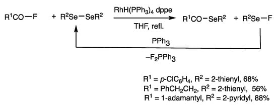 Rhodium-catalyzed reactions of disulfides can be applied to diselenides (Scheme 6) [38]. Bis(2-pyridyl) diselenide and 1-adamantanecarbonyl fluoride were reacted in the presence of RhH(PPh3)4 (2.5 mol%) and dppe (5 mol%) in refluxing chlorobenzene, and 1-adamantanecarbonyl 2-pyridylselenoester was obtained in 88% yield. This method was used for the synthesis of heteroaryl selenoesters, which are generally less stable than aryl thioesters. The heteroaryl compounds can be used for the synthesis of novel organoselenium compounds.