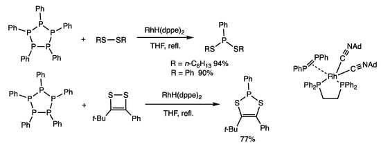 - Arisawa, M.; Sawahata, K.; Yamada, T.; Sarkar, D.; Yamaguchi, Y. Rhodium-Catalyzed Insertion Reaction of PhP Group of Pentaphenylcyclopentaphosphine with Acyclic and Cyclic Disulfides. Org. Lett. 2018, 20, 938–941. [Google Scholar] [CrossRef]