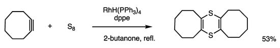 - Arisawa, M.; Ichikawa, T.; Tanii, S.; Yamaguchi, M. Synthesis of Symmetrical and Unsymmetrical 1,4-Dithiins by Rhodium-Catalyzed Sulfur Addition Reaction to Alkynes. Synthesis 2016, 48, 3107–3119. [Google Scholar] [CrossRef]