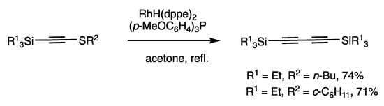 When 1-(triethylsilyl)-acetylene was treated with dibutyl disulfide in the presence of RhH(PPh3)4 (2 mol%) and diphenylphosphinoferrocene (dppf) (3 mol%) for 1 h in refluxing acetone, 1-butylthio-2-triethylsilylacetylene was obtained in 80% yield, which was accompanied by a thiol (Scheme 7) [39]. The reaction of a thiol and a 1-thioacetylene formed the original 1-alkyne under argon atmosphere. 1-Alkynes/disulfides and 1-thioalkyne/thiols are under chemical equilibrium in the presence of rhodium catalysis. The rhodium complex also rapidly oxidizes thiols to disulfides and water in the presence of a trace amount of oxygen (Scheme 7 and Scheme 23). In combination with the oxidation reaction under air, the thiolation reaction of 1-alkynes proceeds in an energetically downhill manner to provide 1-thioalkynes in higher yields. The interconversion reactions proceed between 1-alkynes and 1-thioalkynes.