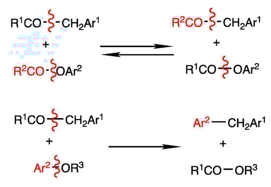 - Arisawa, M.; Kuwajima, M.; Toriyama, F.; Li, G.; Yamaguchi, M. Rhodium-Catalyzed Acyl-Transfer Reaction between Benzyl Ketones and Thioesters: Synthesis of Unsymmetric Ketones by Ketone CO-C Bond Cleavage and Intermolecular Rearrangement. Org. Lett. 2012, 14, 3804–3807. [Google Scholar] [CrossRef]