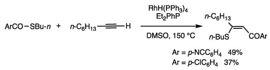 - Arisawa, M.; Igarashi, Y.; Tagami, Y.; Yamaguchi, M.; Kabuto, C. Rhodium-catalyzed Carbothiolation Reaction of 1-Alkylthio−1-Alkynes. Tetrahedron Lett. 2011, 52, 920–922. [Google Scholar] [CrossRef]