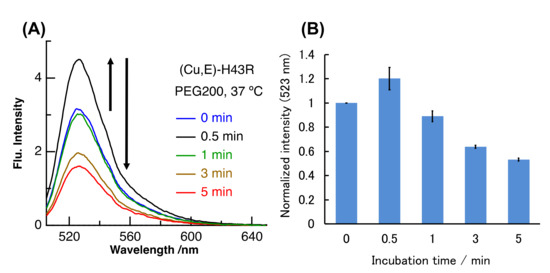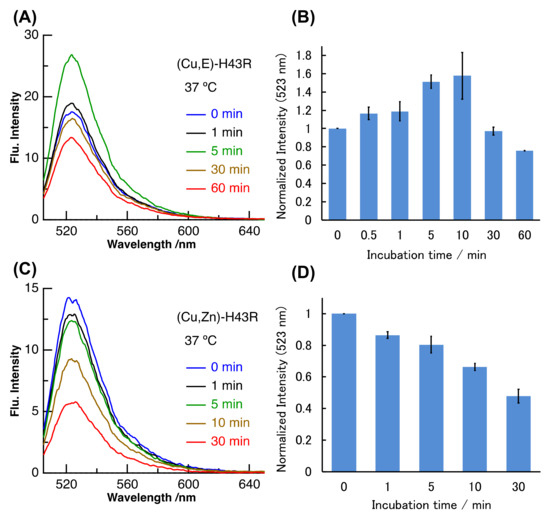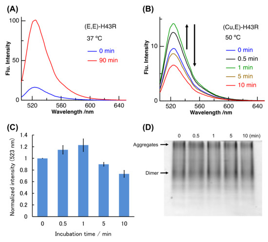 We measured the DCF fluorescence due to (Cu,E)-H43R at 50 °C (Figure 2B). The DCF fluorescence intensity increased with incubation time (0–1 min), then decreased gradually (1–10 min). This result indicates that (Cu,E)-H43R also acquired the pro-oxidant activity following the incubation at 50 °C, but this activity was much lower than that of the denatured (E,E)-H43R that subsequently bound Cu2+ at 37 °C (Figure 2A). Figure 2C shows the fluorescence intensities due to (Cu,E)-H43R, normalized by the fluorescence intensity at 0 min. The pro-oxidant activity was convex-shaped, first increasing and then decreasing with incubation time.