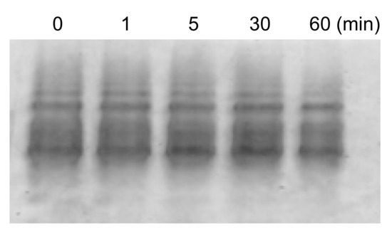 High temperatures such as 50 °C likely induce structural changes in (Cu,E)-H43R, resulting in the increase in the pro-oxidant activity. However, since high temperature of 50 °C does not occur in vivo, the same experiment was performed at a physiological temperature (37 °C; Figure 3A,B). Incubation at 37 °C in buffer solution also increased the DCF fluorescence intensity of (Cu,E)-H43R, leading to the conclusion that (Cu,E)-H43R also acquired the pro-oxidant activity after the incubation at physiological temperature. The pro-oxidant activity at 37 °C increased slowly compared to that at 50 °C, reaching a maximum at 5–10 min and then decreased with incubation time. As shown in Figure 3C,D, only a decrease in the DCF fluorescence intensity with incubation time was observed for (Cu,Zn)-H43R, confirming that the increase in the pro-oxidant activity of (Cu,E)-H43R arises from the deficiency of a Zn ion. As is the case of 50 °C, the decrease in the pro-oxidant activity with incubation time was observed both for (Cu,E)- and (Cu,Zn)-H43R at 37 °C, and no aggregation of (Cu,E)-H43R with increasing incubation time was observed in native-PAGE (Figure 4).