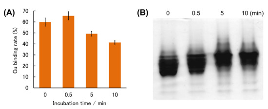 We thus prepared (Cu,E)-H43R by adding one equivalent of Cu2+ to solution of (E,E)-H43R, and measured the change in the amount of Cu ions bound to H43R with incubation time. The 4-(2-pyridylazo)-resorcinol (PAR) method was used to estimate the amount of the coordinated Cu ions. PAR is a chelator that exhibits visible absorption upon binding Cu2+ (PAR-Cu2+ complex). Sequential addition of two strong chelators, nitrilotriacetic acid (NTA) and ethylenediaminetetraacetic acid (EDTA), to the PAR solution removes Cu2+ from PAR and reduces visible absorption due to the PAR-Cu2+ complex. Therefore, measurement of the difference in absorbance before and after the addition of NTA and EDTA allows for the estimation of the concentration of Cu2+ in the sample solution based on a calibration curve prepared with Cu2+ solutions of known concentrations [29,43]. The amount of Cu ions bound to SOD1 in the (Cu,E)-H43R solution decreased by ~20% after 10 min incubation at 50 °C (Figure 6A), corresponding to the decrease in the pro-oxidant activity shown in Figure 2. This result implies that the gradual decrease in the pro-oxidant activity is partly due to the desorption of Cu ions from H43R. Note that (Cu,E)-H43R used in Figure 6 was prepared from (E,E)-H43R, which is different from (Cu,E)-H43R prepared without prior formation of its (E,E) form in Figure 2, Figure 3, Figure 4 and Figure 5. The effect of the apo formation is apparently not negligible. The reduced binding rate of Cu ions to (Cu,E)-H43R in Figure 6A is not due to aggregate formation because no aggregation was detected by native-PAGE for (Cu,E)-H43R prepared via the (E,E) form with the incubation (Figure 6B).