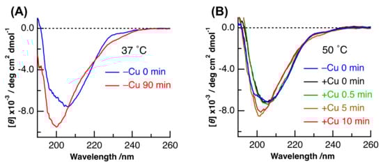 CD spectra of (Cu,E)-H43R with different incubation times were measured to examine the time-dependent change in the secondary structure. We previously showed that the denaturation of SOD1 can be confirmed by the change in its CD spectrum [27,28,29,30,31,32]. As is the case of (E,E)-H43R at 37 °C in Figure 7A, the CD spectrum exhibits a decrease and an increase in intensity at around 215 and 225 nm, respectively, with incubation time, which results from the decrease in β-sheet and turn structures and the increase in irregular structures in (E,E)-H43R. The irregular structure was estimated to increase by 15–20% [27] after the 90 min incubation at 37 °C.