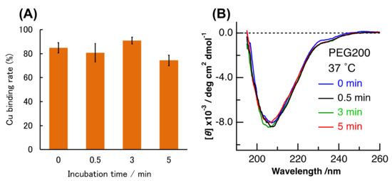 Similar experiments were conducted in crowding environment. PAR and CD measurements were performed for (Cu, E)-H43R prepared from (E,E)-H43R, as mentioned above in the presence of PEG200 at 37 °C, and the results are shown in Figure 8. The shape of the CD spectrum remained unchanged with time within experimental uncertainty (Figure 8B), and the amount of bound Cu ions slightly decreased by ~10% after 5 min incubation (Figure 8A). The shape of the CD spectrum in crowding environment is the same as that in buffer solution after 0–0.5 min incubation at 50 °C (Figure 7B), which is assigned to the partial structural change. As mentioned above, the pro-oxidant activity in crowding environment is convex-shaped, first increasing and then decreasing with incubation time (Figure 5B), which is the same as the case in buffer solution at 50 °C (Figure 2C). Therefore, the partial structural change induced the increase in the pro-oxidant activity of (Cu,E)-H43R in both the conditions: at 50 °C, and in a crowding environment. It seems also to be consistent with the decrease in the pro-oxidant activity in response to the loss of coordinated Cu ions (Figure 8A), although the magnitude of the Cu-desorption is smaller in molecular crowding environment.
