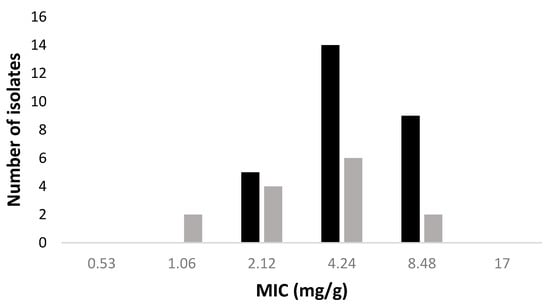 Minimum inhibitory concentrations (MIC) of ozonated oils against 28 methicillin-resistant S. aureus (MRSA) (black) and 10 methicillin-susceptible S. aureus (MSSA) (grey) strains.