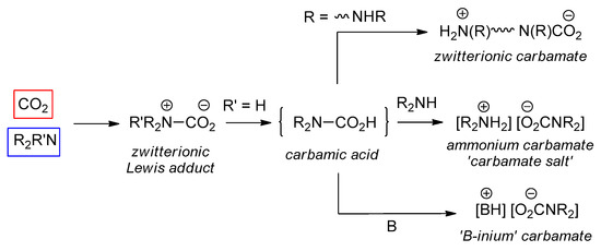 An overview of the reactivity of CO2 with amines is depicted in Scheme 1. When the lone pair on the nitrogen atom attacks the carbon atom of CO2, a zwitterionic Lewis acid/base adduct can be formed. At this step, a hydrogen atom can migrate from nitrogen to oxygen, affording the elusive carbamic acid. The detection of this species is extremely difficult [43,44,45,46] and its isolation rare [47]. The fate of the carbamic acid depends on the nature of the amine and the reaction environment. Most frequently, a second equivalent of N-donor can act as a Brønsted base affording an ammonium carbamate salt. In some cases, deprotonation of a carbamic acid may be operated by a second basic group present in the structure of the employed amine (e.g., diamine), affording a zwitterionic carbamate. Furthermore, the deprotonation can be forced when an external base, B, is added to the system, producing a “B-inium” carbamate.