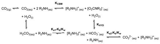 In most of the cases, either using ammonia, primary or secondary amines, the equilibrium constants regulating the hydrolysis of carbamate to bicarbonate (KHYD in Scheme 2) are lower than 1, while equilibrium constants for the formation of carbamate (KCBM in Scheme 2) are >103. The only exception to this trend (KHYD >> KCBM) was observed for aniline [64], while the formation of carbamato salts derived from diisopropylamine [65], di-sec-butylamine [66] and 2-amino-2-methyl-1-propanol (AMP) [52] was not assessed. Piperazine may form a bis-carbamate, but the generation of the second carbamato unit is unfavorable (KHYD > KCBM) [53].