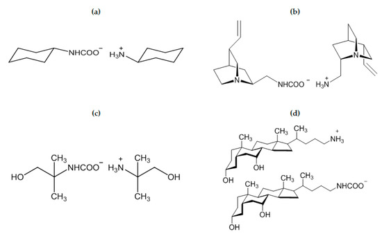 Structures of alkylammonium alkylcarbamate derived from cyclohexylamine (a) [75], 2-amino-2-methyl-1-propanol, AMP (b) [82], quincoridine (c) [80], C24 amine derivative of chenodeoxycholic acid (d) [81].