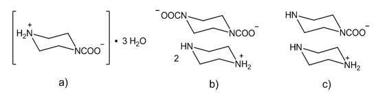 Carbonation products of piperazine: zwitterionic carbamate (a), di-carbamate (b) and “ammonium” carbamate (c).