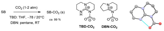 The first experimental evidences of SB-CO2 adducts were collected analyzing the solid materials obtained from the reactions of 1,5,7-triazabicyclo[4.4.0]dec-5-ene (TBD), 1,5-diazabicyclo[4.3.0]non-5-ene (DBN) and related systems with carbon dioxide in acetonitrile [89,90]. A 13C-NMR signal occurring at circa 150 ppm was attributed to the NCO2 moiety, whereas a signal around 160 ppm is related to the co-presence of bicarbonate ions. Unambiguous identification of the zwitterionic carbamates TBD-CO2 and DBN-CO2 (Scheme 6) was later provided by single crystal X-ray diffraction [91,92].