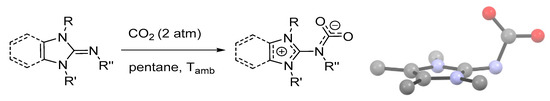Carbonation of 1,3-dihydro-2H-imidazol-2-imines and benzo[d]imidazole analogues, and view of the crystal structure of the CO2 adduct of 1,3-di-tert-butyl-N-methyl-1,3-dihydro-2H-imidazol-2-imine (R = R′ = tBu; R″ = Me) as a representative example. Drawing based on published structural data, H atoms omitted for clarity [92].
