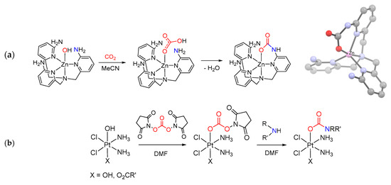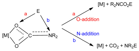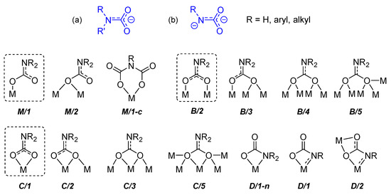 Carbamato ligands, as previously defined [42], are monoanionic species with general formula R2NCO2(−) (R = H, alkyl or aryl group), resulting from the combination of carbon dioxide with ammonia or most frequently primary/secondary amines. Such anions usually behave as O-donors towards metal centers, giving rise to metal carbamato complexes (Scheme 13a). In the present review, we will adopt a general definition of carbamato ligands, which includes those derived from other N-donors (e.g., pyridines and related systems) and also dianionic carbamyldiide species, RN(−)CO2(−) (Scheme 13b).