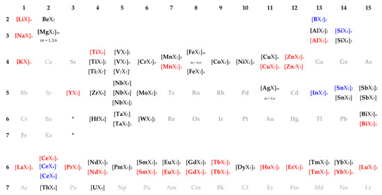 Periodic table of homoleptic carbamato complexes [MXn]m0/− (X = O2CNR2; R = H or alky/aryl group); only isolated and characterized compounds are included. Examples not covered in the previous review are highlighted in red (new compounds of already-known types) or in blue (first metal carbamate ever reported). n = unknown nuclearity or polymeric.