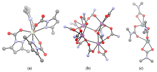 View of the X-ray crystal structure of (a) [Ce(O2CMe2pz)4], (b) [Bi(O2CNiPr2)3]4 (iPr groups omitted for clarity), (c) [Sn(O2CNMe2)2]2. Drawings based on published data [134,135,136], H atoms omitted for clarity.