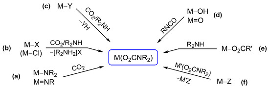 The instability of some metal N,N-dialkylamides and the difficulties in their preparation, particularly with aryl or complex alkyl groups, prompted the development of alternative synthetic methods. Thus, in 1978, Calderazzo et al. reported the synthesis of uranium(IV) N,N-dialkylcarbamates, [U(O2CNR2)4], starting from the corresponding anhydrous metal chloride as precursor and NHR2 saturated with CO2 as the carbamato source [137]. Since then, the R2NCO−/Cl− metathetical reaction (Scheme 15b) has been employed for the synthesis of a vast number of metal carbamates, including heteroleptic derivatives (see Section 3.2), and can be regarded as the most general synthetic method [42,138]. In the case of secondary amines, the reaction is conveniently carried out in toluene or aliphatic hydrocarbons, wherein the insoluble dialkylammonium chloride byproduct can be easily filtered off, leaving a solution of the metal carbamato product.
