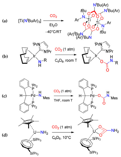 Carbon dioxide is a an easily available and non-toxic chemical, and at the same time, it is implicated in environmental, energy and sustainability issues [1,2,3,4]. Thus, the last two decades have witnessed an unprecedentedly intense effort of academic and industrial research in two main directions, i.e., to exploit CO2 as a C1 synthon for organic synthesis [5,6,7,8,9,10,11] and to develop more and more efficient systems able to capture and store CO2 [12,13]. The former goal is challenging for a variety of reactions, and a wide number of metal catalysts have been proposed to access valuable organic compounds and materials via CO2 fixation strategies, which, however, require harsh conditions (high temperature and CO2 pressure) in several cases [14,15]. It is worthy to note that, differently to other small molecules such as its relative carbon monoxide, carbon dioxide is a “bad” ligand for transition metals; therefore, examples of simple coordination compounds are relatively rare [16,17,18,19,20,21] and, accordingly, metal catalysts working in CO2 activation routes usually exert their action without the intermediacy of metal-CO2 adducts. The “weak point” in the apparently unscratchable robustness of carbon dioxide is the susceptibility to nucleophilic attacks at the carbon atom [22,23,24]. Thus, a range of nucleophilic reagents, including neutral N-heterocyclic carbenes [25,26], are known to react with CO2 even under mild conditions, and some chemistry at transition metal centers is provided by the possibility of CO2 insertion into the bond between a metal atom and a suitable anionic ligand, e.g., alkyl, allyl, alkoxide and hydride [27,28,29,30,31,32]. In this context, amines are key reactants towards carbon dioxide, and indeed carbon dioxide/amine systems have been intensively investigated in the field of capture/storage [33,34,35] and exploited for the incorporation of the CO2 moiety within organic structures [36,37,38,39]. Furthermore, CO2 is also prone to insertion reactions into a variety of metal-amide bonds, generating a carbamato ligand; however, metal complexes containing carbamato ligands are easily available through diverse synthetic routes not requiring the use of pressurized CO2. It is remarkable that the preliminary formation of a magnesium-carbamato adduct generated from a lysine residue is widely exploited by the universal Rubisco enzyme to incorporate CO2 in biomolecules [40,41]. Notably, metal carbamates (either homoleptic or not) have been reported for a wide number of elements throughout the periodic table and, due to this systematicity and their intriguing properties that will be described below, the chemistry of metal carbamates has seen a significant advance in the recent times. This review follows up a previous review on the same topic published in 2003 by Calderazzo, Pampaloni and coworkers [42]; herein, we will summarize fundamental concepts regarding the reactivity of CO2 with amines, then we will discuss synthetic, structural and reactivity aspects of metal carbamates and their potential in various applications, with a particular focus on the findings appeared in the literature after 2003.