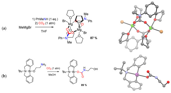 Concerning p-block metals, carbonation of metal amides was recently used to obtain [Bi(O2CNiPr2)3]4 from Bi(NiPr2)3 [135] and [Sn(O2CNMe2)2]2 from Sn(NMe2)2 [136] (Scheme 16b,c). Most notably, these complexes represent the first examples of structurally characterized bismuth carbamate and homoleptic Sn(II) carbamate, respectively.