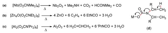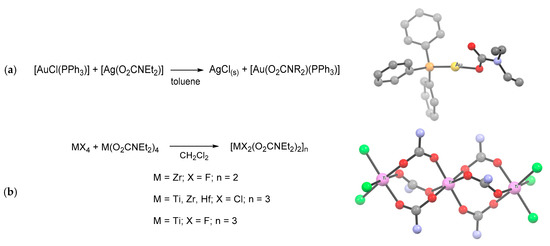 Recent examples of homoleptic carbamates obtained by ligand substitution from the respective metal chlorides include [Ti(O2CNPyr)4], being the first pyrrolidine-based metal carbamate (Scheme 17a) [139], [Cu(O2CN(allyl)2)2] [140], [NH2iPr2][B(O2CNiPr2)4] and [B2(O2CNiPr2)6] [141] and [In(O2CNEt2)3] [142].