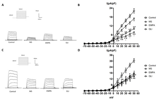 Figure 2C,D demonstrates the effects of adipocytokines from the peripheral fat tissue of study groups on the IK in H9c2 cells. As Figure 2C demonstrated, the amplitude of IK increased more when the membrane potentials became more positive in all groups. The average relationships between the IK (pA/pF) and membrane potentials were calculated and are shown in Figure 2D. Compared with that in the control group, the IK was significantly lower in the MS, EMPA, and GLI groups from 10 to 50 mV (all p < 0.05). However, the IK was not significantly different among the MS, EMPA, and GLI groups (all p > 0.05).
