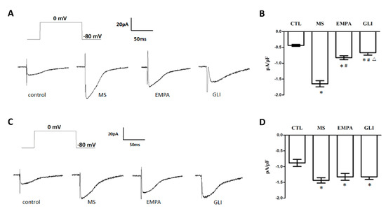 Effects of adipocytokines from the pericardial and peripheral fat tissues of study groups on L-type calcium channel current (ICa,L) in H9c2 cells. (A) Representative recordings of the ICa,L evoked by applying a pulse of 0 mV for 300 ms at a holding potential of −80 mV in H9c2 cells treated with adipocytokines from the pericardial fat of different groups for 18 h. (B) Bar graph showing the ICa,L (pA/pF) averaged from the recordings of the trace (n = 6). (C) Representative recordings of the ICa,L evoked by applying a pulse of 0 mV for 300 ms at a holding potential of −80 mV in H9c2 cells treated with adipocytokines from the peripheral fat of different groups for 18 h. (D) Bar graph showing the ICa,L (pA/pF) averaged from the recordings of the trace (n = 6) (C). Data are the means ± standard deviation. * p < 0.05 compared with the control. # p < 0.05 compared with the MS; △p < 0.05 compared with the EMPA; MS: metabolic syndrome; EMPA: empagliflozin; GLI: glibenclamide.