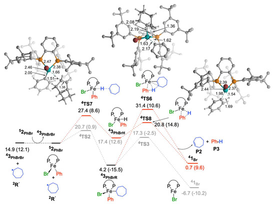 The generated radical intermediate R· can react with either 43PhBrBr (iron(III)-species, in-cage mechanism) or 52PhBr (iron(II)-species, out-of-cage mechanism) present in the reaction mixture [36,38]. For the reaction of cycloheptyl radical (R·) with iron(II) species, the first step involves the out-of-cage movement of 2R· from the intermediate 43PhBrBrR. Then the 2R· coordinates to the iron center through 4TS2 with a lower barrier than 5TS1 (20.7 kcal/mol from starting 52PhBr and 5.8 kcal/mol from the second 52PhBr, Figure 3). It leads to the formation of lower energy iron(III) species 43PhBrR, which is 11.7 kcal/mol lower in energy. The consequent reductive elimination forms C–C coupling product P1, which proceeds with the activation barrier of 13.1 kcal/mol (4TS3). The reductive elimination process is highly exergonic and the corresponding iron(I)-product complex (41Br-PhR) is 16.6 kcal/mol lower in energy than 43PhBrR. Afterwards, the product will decoordinate from 41Br-PhR leading to the formation of 5.7 kcal/mol higher energy species 41Br, probably through a barrierless process. The transient species 41Br readily reacts with a THF molecule (solvent) leading to the formation of lower energy species 41Br-THF (0.9 kcal/mol lower energy than 41Br-PhR). The whole process for the reaction of FeIIBrPh(SciOPP) with bromocycloheptane leading to the formation of product and 41Br-THF is exergonic by 13.3 kcal/mol.