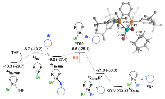 The iron(I) species formed during the reaction can react either with another iron(III) species to undergo a comproportionation to generate two iron(II) species, or with haloalkane substrate (of which concentration is larger than iron(III) species) to generate one iron(II) species and an alkyl radical intermediate. For the reaction to proceed the first step is the removal of THF from 41Br-THF to form 41Br and this process is endergonic by 6.6 kcal/mol (Figure 5). This step is required for both comproportionation and reaction with the haloalkane substrate. The coordination of the substrate through bromide to 41Br, leading to the formation of 41Br-BrR is exergonic by 2.3 kcal/mol. The activation barrier for the Br-atom transfer (4TS9) from 41Br-BrR species is 6.8 kcal/mol (barrier from 41Br-THF). The process is highly exergonic and leads to formation of cycloheptyl radical and iron(II) species 52BrBr. The generated 52BrBr species will undergo transmetalation and the radical species will react with the available 52PhBr in the reaction mixture, propagating the radical chain reaction [40]. Hence, the reaction will proceed through the out-of-cage mechanism, and similar to our previous study, the current reaction also follows the FeI/FeII/FeIII pathway [38].